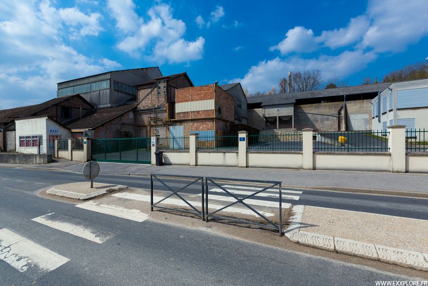Une vue depuis la rue, on y voit les premiers bâtiments encore existants accolés au coteau et derrière ceux rajoutés avec les années, notamment la centrale électrique, l'aire de stockage au fond et sur la droite les bureaux commerciaux.