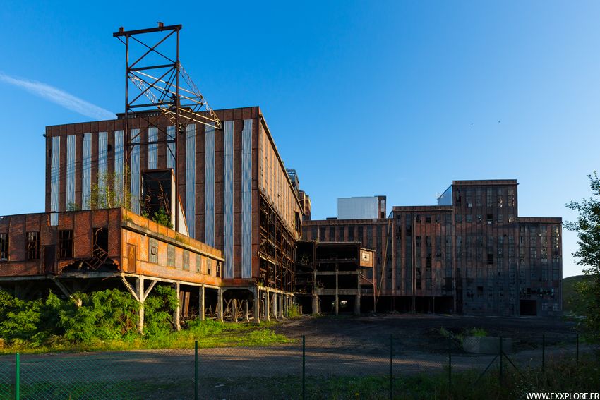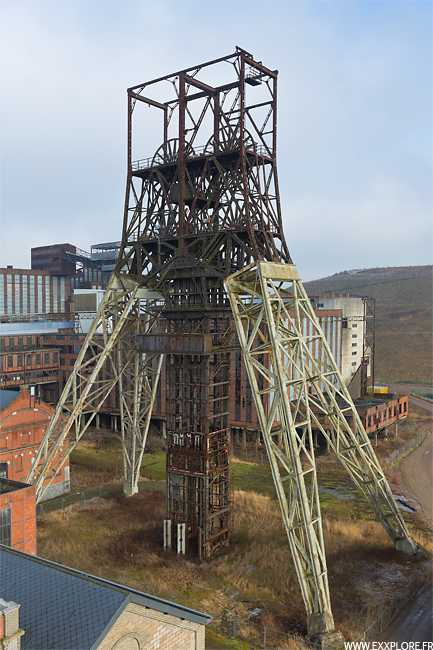 D'un peu plus haut nous apercevons le site dans sa presque totalité, la centrale à droite, les deux puits au centre, et au fond l'énorme lavoir.
