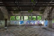 Voici une vue globale sur les installations restantes : atelier, chevalement, bâtiment de la recette et bâtiment de la machine d'extraction.