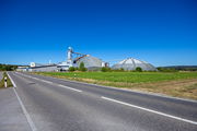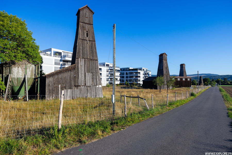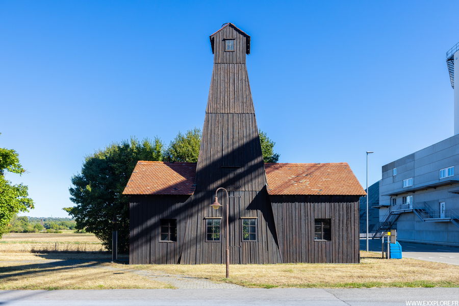Voici une tour de sondage. A l'intérieur se trouve une pompe, elle est actionnée par un moteur qui se trouve dans la petite maison à côté. Une canalisation aussi haute que la tour permet l'extraction de la saumure et l'injection d'eau. La saumure une fois extraite est dirigée vers la saline où elle sera chauffée.