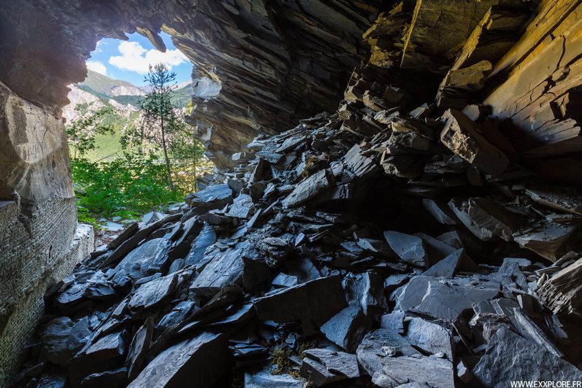 Les dernières ardoisières en activité étaient mieux entretenues, mais cela n'a pas suffit à retenir le temps qui fait pression. A peine quelques mètres et tout est effondré dans un fracas inextricable.