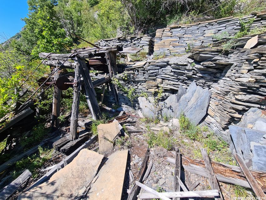 Il s'agit d'un petit groupe d'ardoisières situé à 980m d'altitude, divisé en quatre réseaux exploitant les schistes noirs de l'Oxfordien. Débuté 10 ans après la construction de ce qui deviendra la Route des Grandes Alpes, l'ardoisière se développe à partir de 1897, la production est modeste et augmente significativement après la Première Guerre Mondiale. Cette prospérité amène un flot d'étrangers d'origine italienne. En 1923 la production atteint 3600 tonnes avec 110 ouvriers.