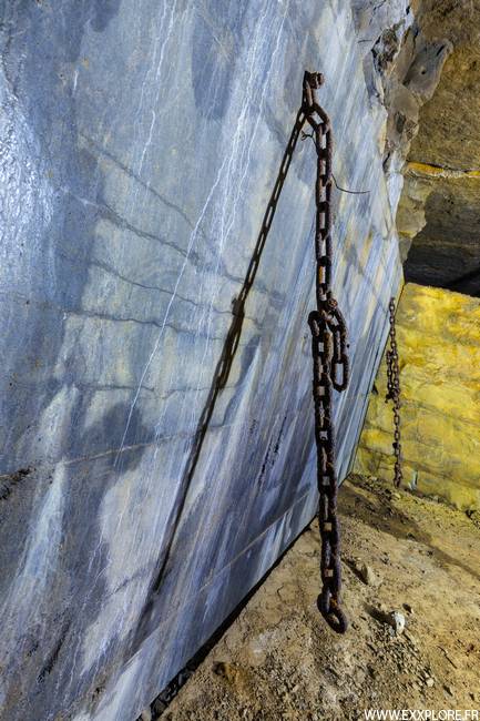 La seule chambre visible présente encore toutes les traces d'exploitation, chaîne, tirants, chandelles dans un espace assez réduit mais charmant. Les parois lisses sont découpées au câble diamanté et plus bas on observera les traces laissés issus de la perforation serrée au marteau pneumatique pour le desserrage des blocs.