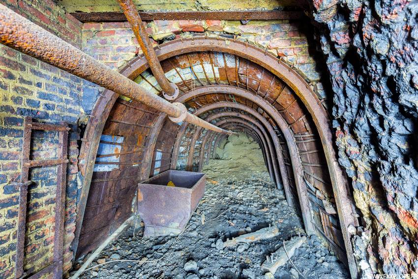 La galerie est entièrement cintrée, elle recoupe un premier croisement qui est la jonction vers la seconde entrée, où se trouve une benne, mais celle-ci est effondrée de ce côté. Les tuyaux sont là pour amener l'air comprimé au fond. La galerie creusée dans le rocher est en très mauvais état, les barres métalliques de faible épaisseur ne supportent pas assez bien les blocs et la pression des terrains. Les planches en bois entre les renforts et la roche sont devenus inexistantes !