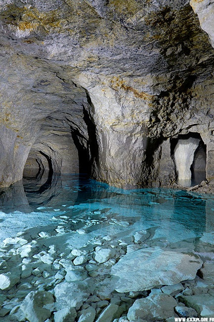 La carrière est exploitée en chambres par un grand nombre de piliers tournés de 4/5m de hauteur, s'étendant sur plus d'une centaine d'hectares, 300km de galeries dont une moitié est noyée sous les eaux. A de nombreux endroits on peut quand même constater que l'eau baisse, ou s'est retirée, en laissant la marque du niveau atteint sur les parois.