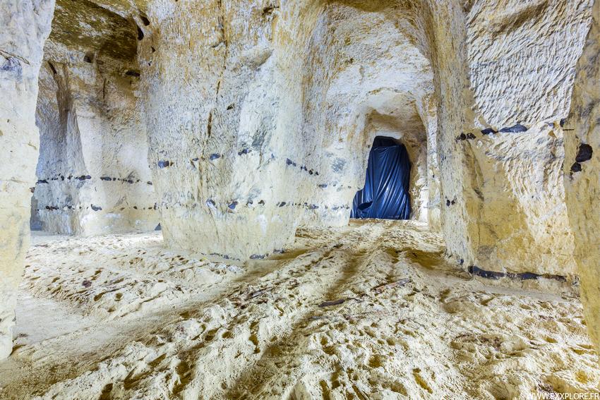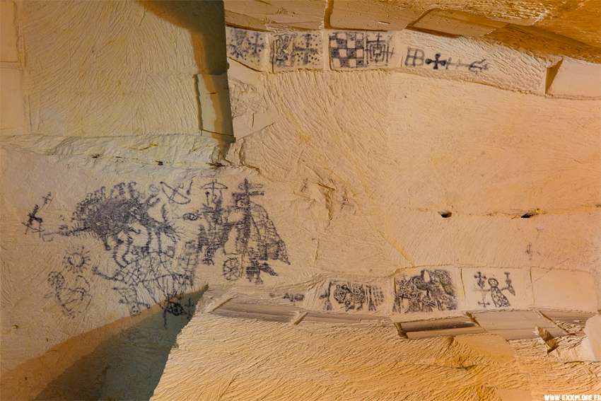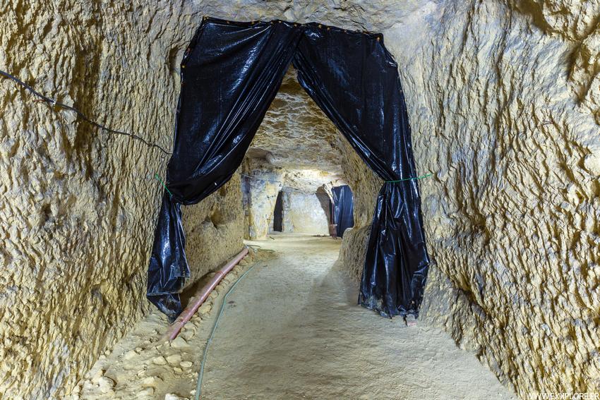 Juste à côté se trouve des galeries bien différentes, peu hautes et arrondies, l'exploitation ne s'est pas faites sur toute la hauteur. Il ne s'agit pas de piliers tournés mais de galeries filantes. Cette zone servait également à la champignonnière, tout est encore équipé comme si cela servait encore mais il n'y a plus rien aujourd'hui. On peut lire sur quelques parois des noms de rues de villes.