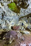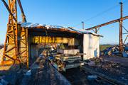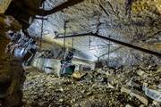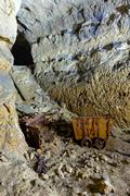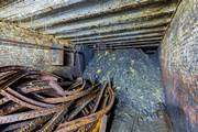 En haut d'une ancienne sortie, une berline est fracassée, et dans une galerie annexe, il reste juste une benne à terre avec son support de rotation, car les berlines étaient orientables.